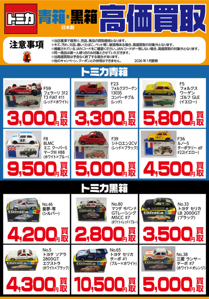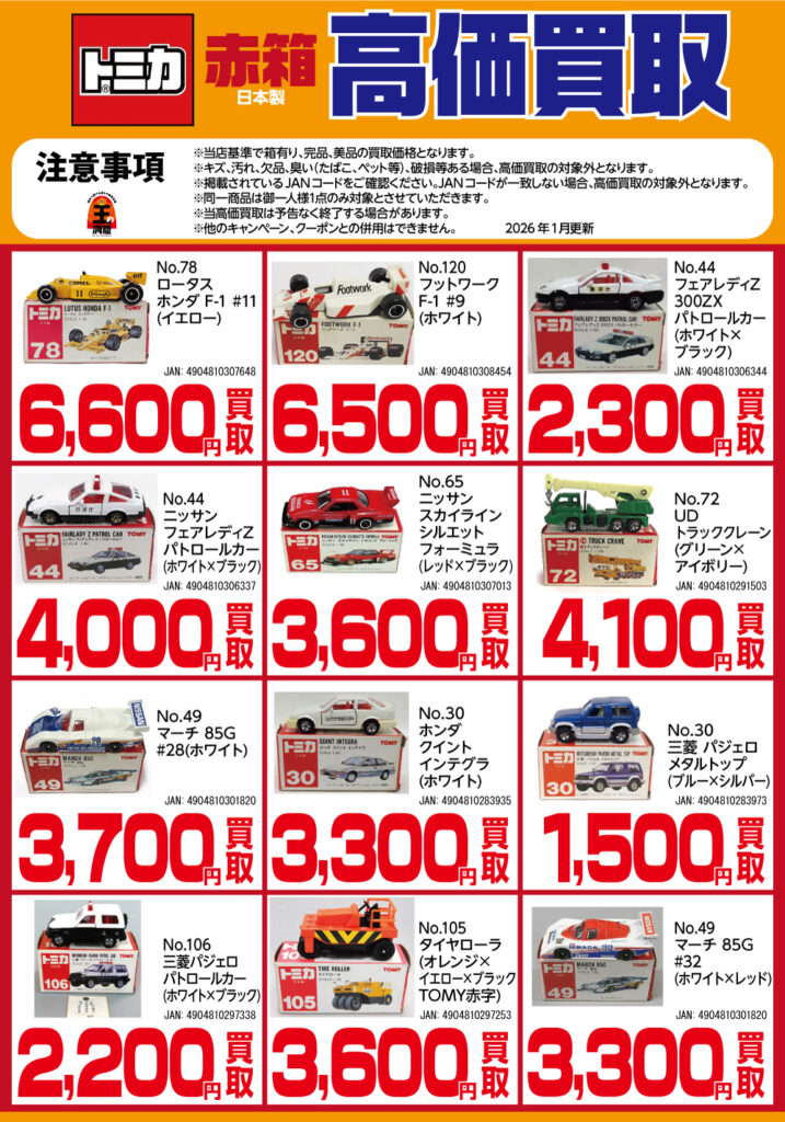 ミニカー高価買取ページ 2022.02.202026.01.22各高価買取・キャンペーンには、数量や商品の状態などの条件がございます。条件を満たさない場合、高価買取・キャンペーンの対象外となりますのでご了承下さい。詳しくは、各買取表に記載されております注意事項をご確認ください