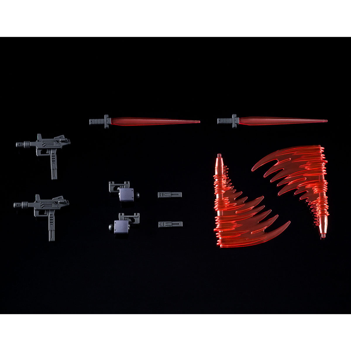 ビーム・ダガーや90mmサブ・マシンガンなどの専用武装が付属。ビーム・ダガーには斬撃エフェクトパーツが付属。